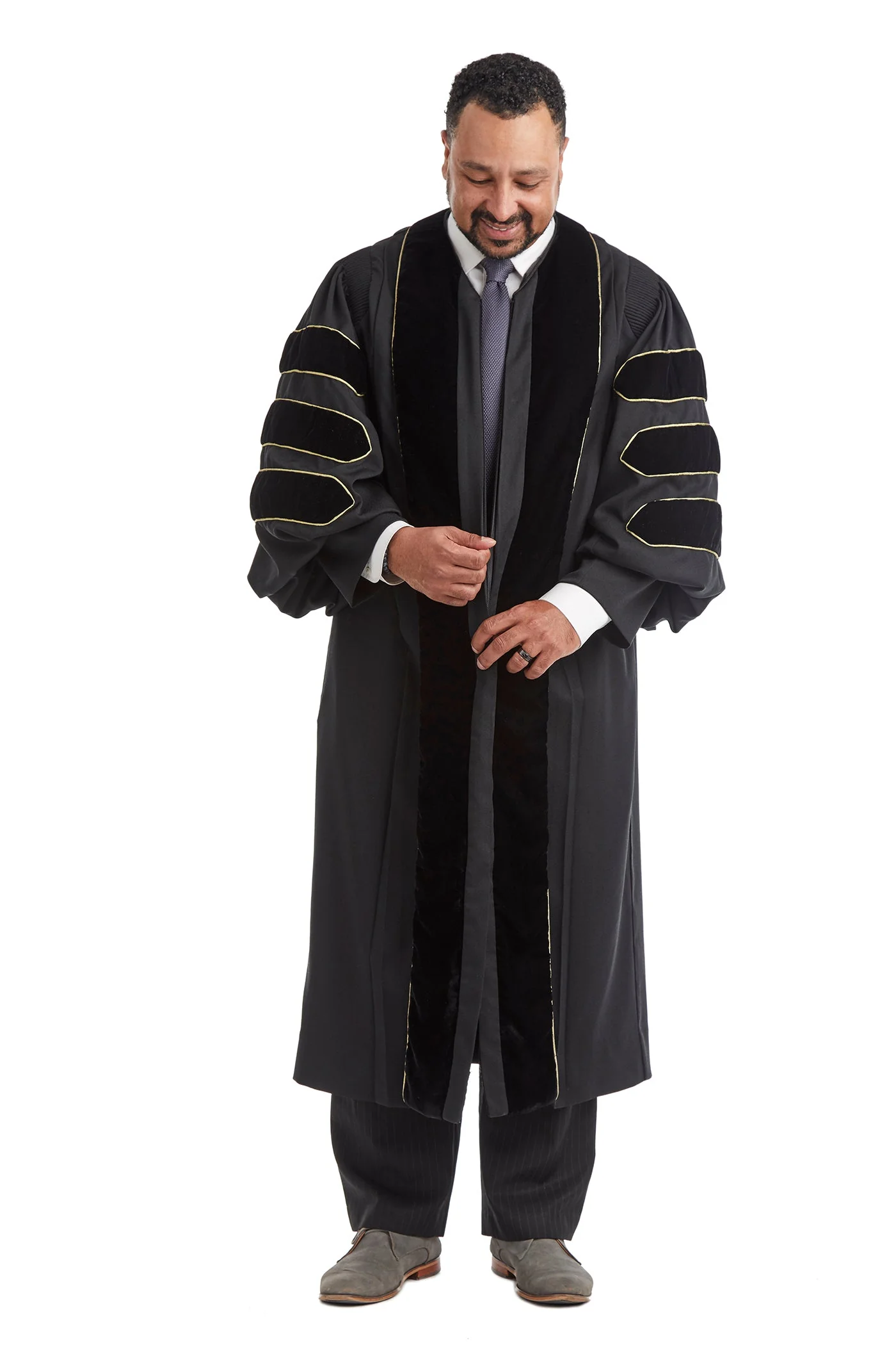 The doctoral gown for the University of Colorado Boulder showcases elegant bell sleeves and is embellished with meticulously placed black velvet chevrons. The front panels are graced with the same rich black velvet, paying homage to the time-honored tradition of the classic Doctoral Gown. Two side pockets are also constructed to allow easy access to your belongings. All our ceremonial gowns meet the University of Colorado Boulder specifications registered with the Intercollegiate Bureau of Academic Costume.