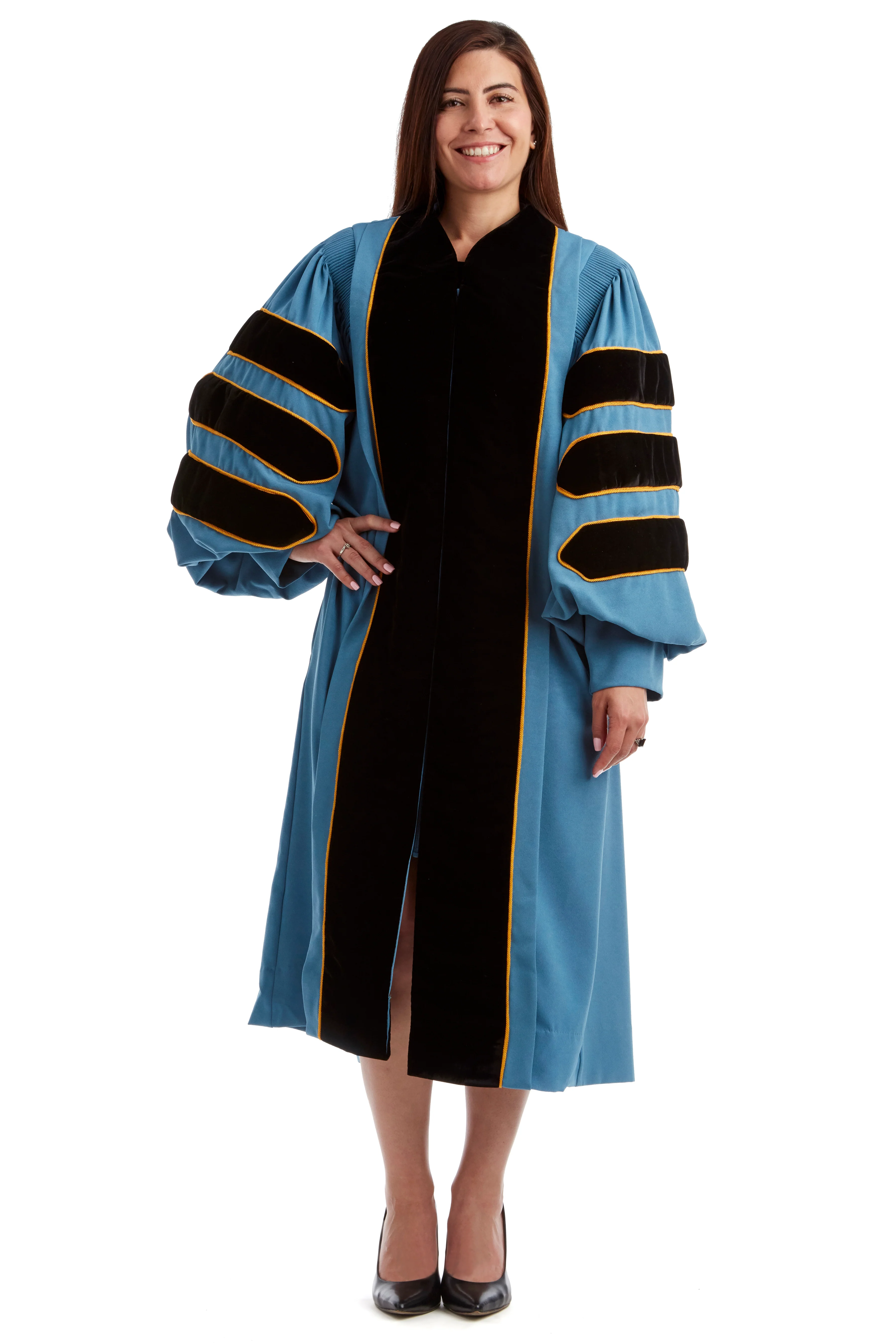 The doctoral gown for the University of Michigan showcases elegant bell sleeves and is embellished with meticulously placed black velvet chevrons. The front panels are graced with the same rich black velvet, paying homage to the time-honored tradition of the classic Doctoral Gown. Two side pockets are also constructed to allow easy access to your belongings. All our ceremonial gowns meet the University of Michigan specifications registered with the Intercollegiate Bureau of Academic Costume.