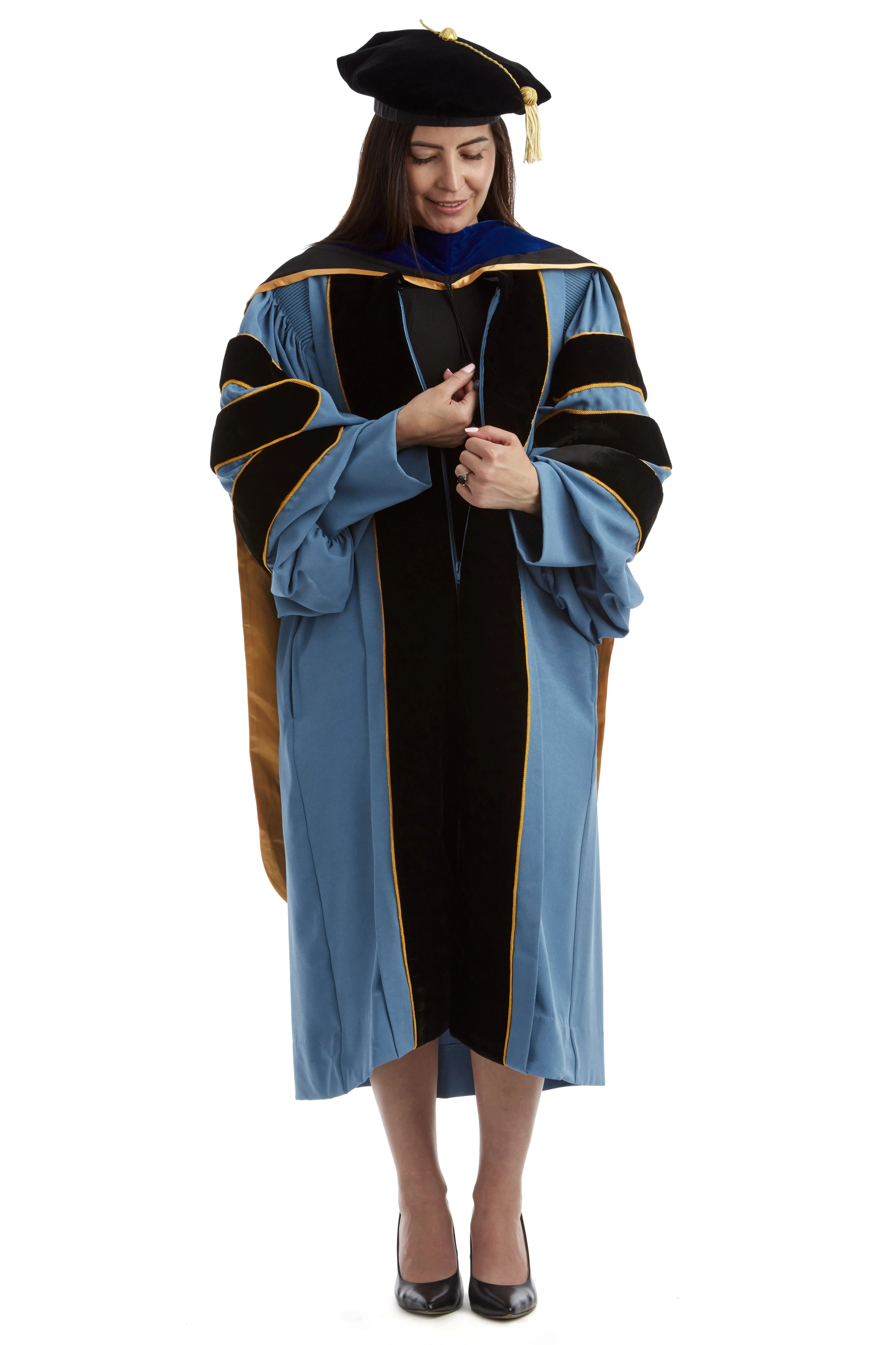 Impeccably crafted, this doctoral regalia set is tailored to perfection for the University of Michigan graduates, meticulously adhering to the institution's unique specifications registered with the esteemed Intercollegiate Bureau of Academic Costume. This complete regalia ensemble encompasses a gown, hood, and tam, designed not only to enhance the grandeur of the commencement stage but also crafted with durability in mind, ensuring it remains a cherished keepsake throughout your academic journey.