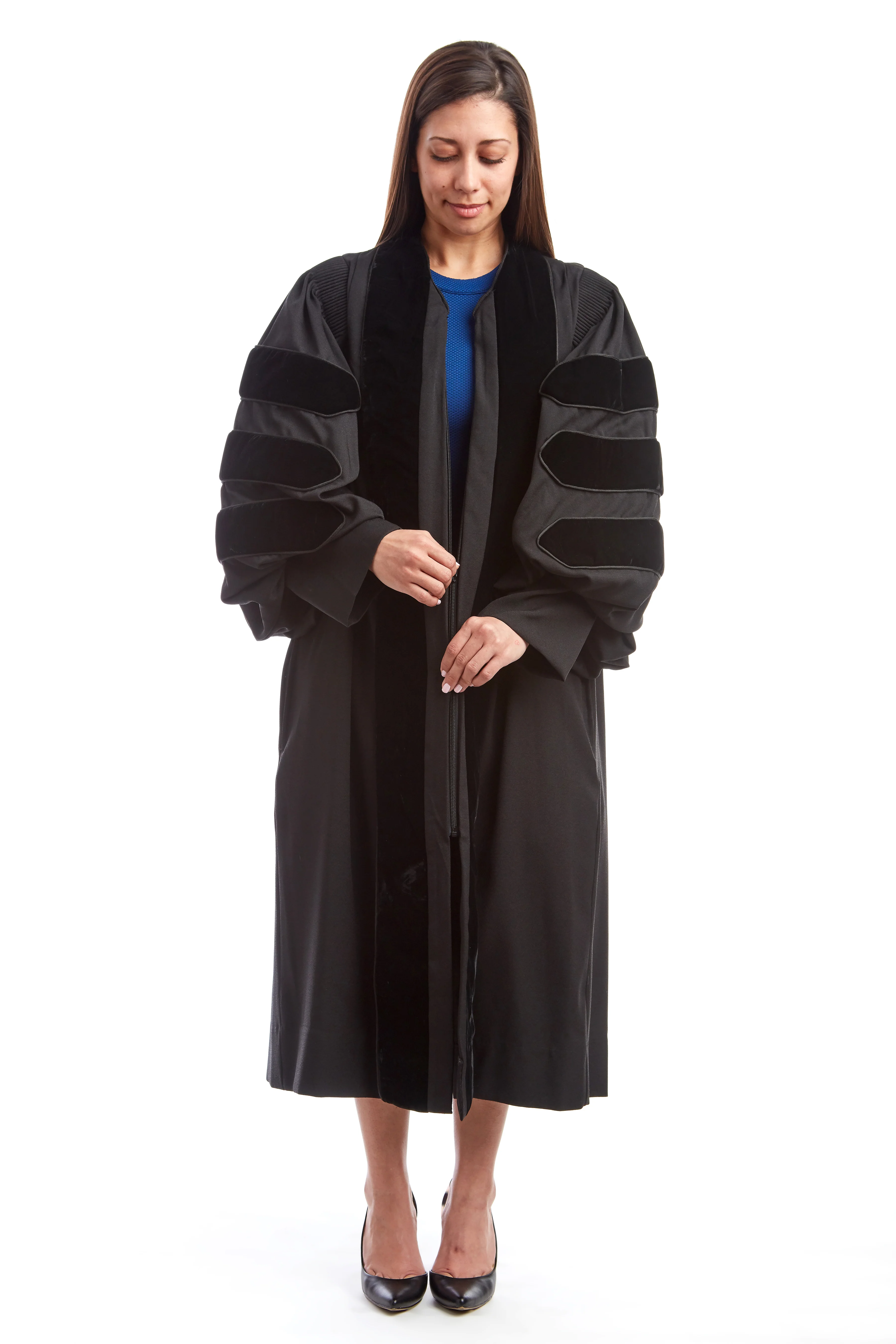 The doctoral gown for doctoral graduates students showcases elegant bell sleeves and is embellished with meticulously placed black velvet chevrons. The front panels are graced with the same rich black velvet, paying homage to the time-honored tradition of the classic Doctoral Gown. Two side pockets are also constructed to allow easy access to your belongings. All our ceremonial gowns meet the specifications registered with the Intercollegiate Bureau of Academic Costume.